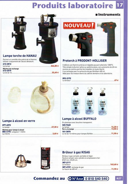 Catalogue français avec une petite lampe à alcool de laboratoire ref 365-9460 au prix de 14,20 euros .