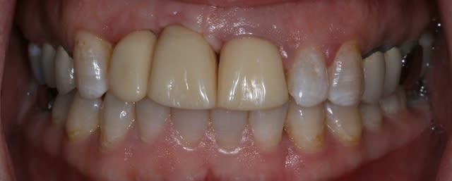 Dans les cas où l'esthétique est en jeu, de 13 à 23, C'est le niveau osseux des dents adjacentes qui dicte le plan de traitement. Un point de contact très gingivale aurait probablement amélioré le cas à long terme entre 13 et 12 sur implant, il ne semble pas y avoir de contatc?? High lip line... encore plus demandant.