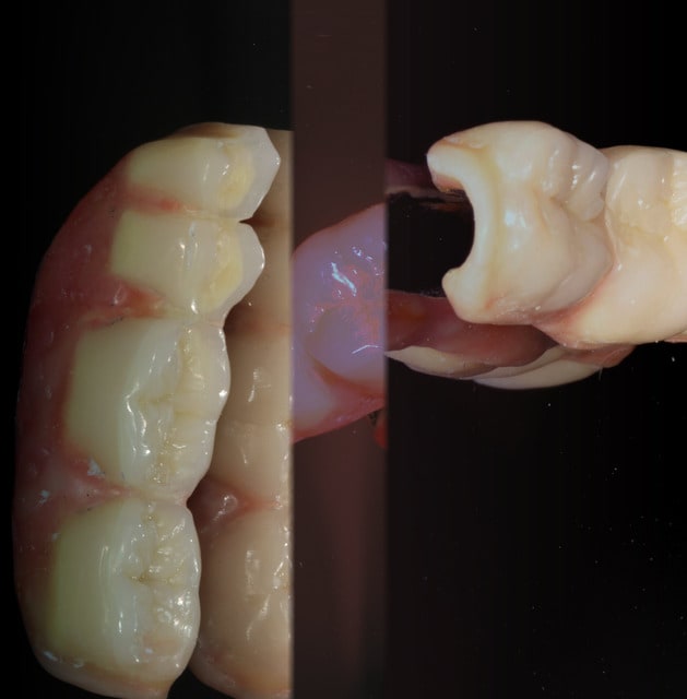 tu prends un miroir photo pour intrabuccal du coté qui évite le dédoublement et tu prends au flash, tu auras cette impression.