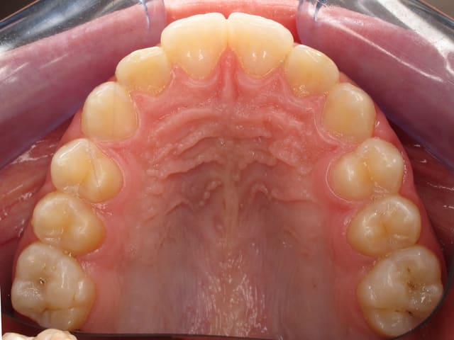 L’image doit inclure le secteur antérieur jusqu’à au moins la surface distale de la première molaire. Au mieux le cliché inclura toutes les dents. La face vestibulaire des dents ne doit pas être visible.