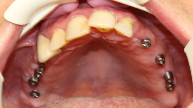 Le sujet : ajuster un stellite après la pose des vis de cicatrisation sur 8 implants.