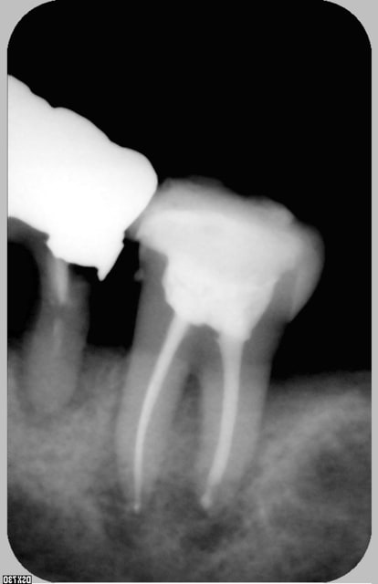 Je relance ce post pour avoir votre avis sur ce cas : jeune femme 25 ans en urgence douleur sourde d'apparition brutale sur 16 dévitalisée .Test morsure positif et papille mesiale enflammée , je démonte l'obturatio et voila ce que je mets en évidence ( il y a en plus un mv2 non obturé).Extraire d'emblée cette dent me fait mal au coeur : y aurait il un traitement à tenter ou que vous auriez réalisé avec succes ? ( la felure ne traverse pas entièrement la dent: localisée en mésiale )