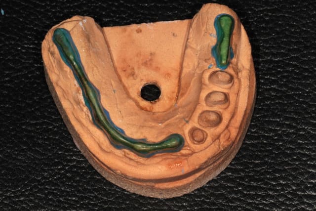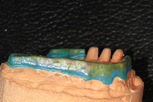 modèle en revêtement préparé par un prothésiste avec masquage des défauts (pour lui) qui ne correspondent pas à ce que je souhaite en bouche.