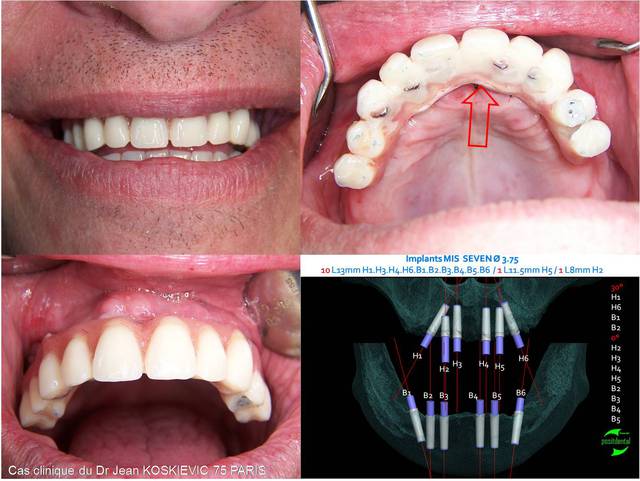 Ci-joint, le jour de la chirurgie, pose d’implants simultanée haut et bas avec lambeaux et provisoire avec barre céramisée. Les provisoires sont restés en place plus d’1 an.