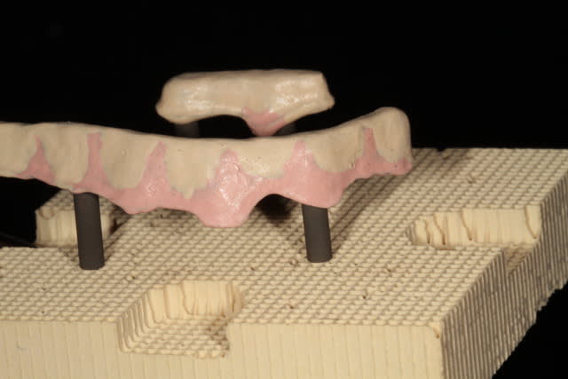 Pxav, la fausse gencive en céramique est délicate à réaliser et souvent peu esthétique. Pour éviter le développement de la plaque bactérienne accentué par la porosité de la résine, une solution peut être la céramisation de l’intrados de la barre.