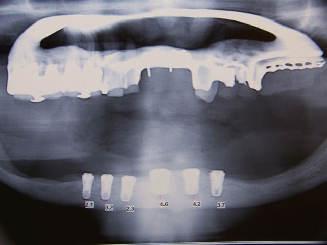 en bas 5 implants symphysaires et en haut, greffes d'apposition pour 4 implants de chaque côté.