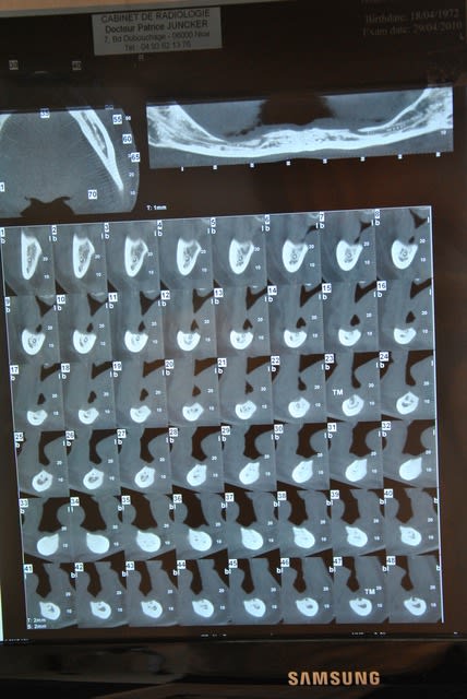 Je lui explique que je ne peux rien dire et surtout pas faire de devis sans scanner. Elle ne comprend pas trop au portugal on lui a fait devis on lui a dit en 10 jours c'est reglé, qu'elle pourrait repartir alors avec quelques choses de fixe en haut et en bas, et tout sans scanner avec une simple panoramique!!!!!