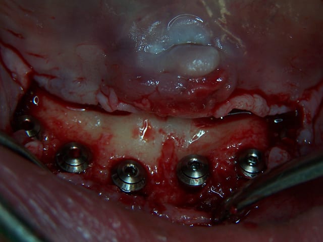 > en bas 5 implants symphysaires et en haut, greffes d'apposition pour 4 implants