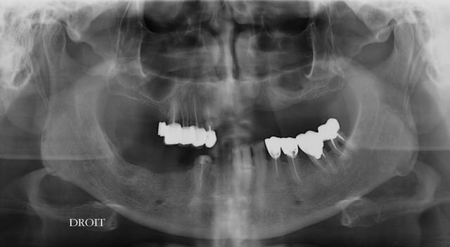Y a t-il eu déjà une greffe ? un comblement type xenogreffe ? une racine comme sous le cantilever en bas....