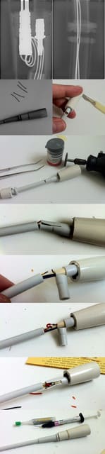 1. identifier le point de rupture à la radio: je pensais que c'était sur la fiche de branchement, mais planméca a laissé du mou, mais c'est en fait au bout de la prise, à l'endroit ou la gaine souple a cassé: pb de conception du au fait que la gaine de jonction est trop souple et trop sollicitée: le silicone a cisaillé, puis le câble électrique a été sollicité et cassé net ( deuxième radio: on voit bien la rupture au centre )