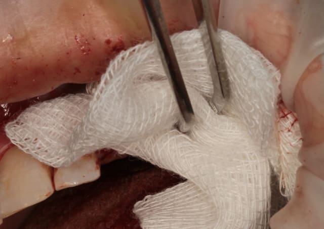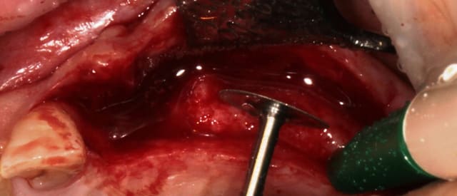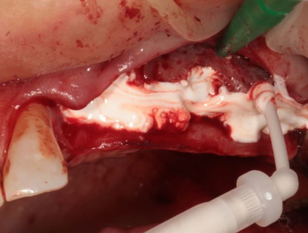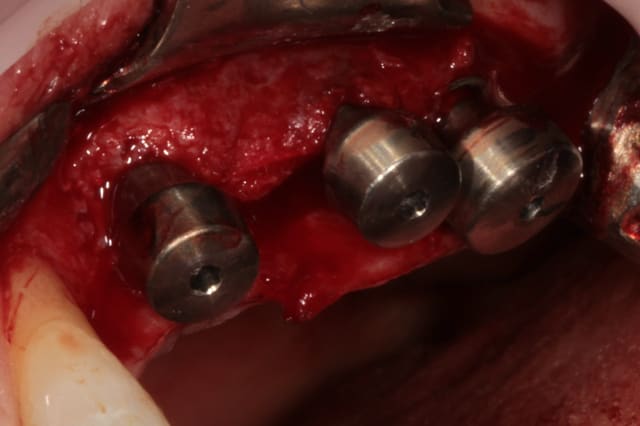 Tu cruantes l'os receveur pour avoir un bon saignement, tu membranes et tu greffes un volume correct dépendant surtout de ta capacité de refermer ensuite le site. Transfixer la membrane sur l'implant au moyen du pilier permet de gagner une marge en tissus mous et surtout de stabiliser la greffe de bio oss qui se trouve comme "gelée" sous la membrane par un caillot. Retrait des sutures à 8 à 12 jours et c'est toujours très beau à voir...