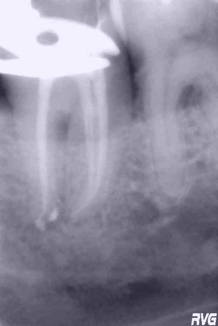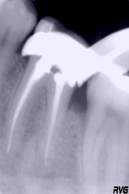 Mark, le temps entre les deux clichés est celui qui sépare les deux messages ; le localisateur me signale l'apex sur les deux racines mésiales, mais effectivement pas sur la racine distale que je n'ai pu explorer plus avant...obturation par thermocompactage, petites sensibilités sur les trois canaux lors de l'obturation...
