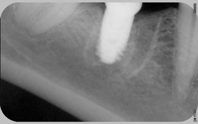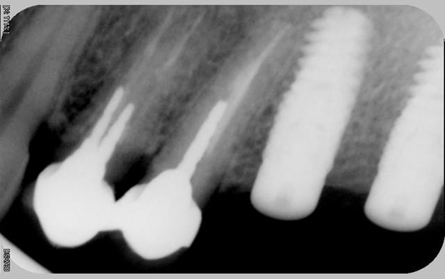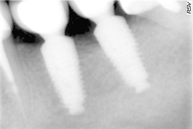 il me semble que sur le 1° cas présenté,la partie biseautée de l'implant est enfouie et que la cratérisation est nulle, idem pour l'implant mésial du dernier cas.