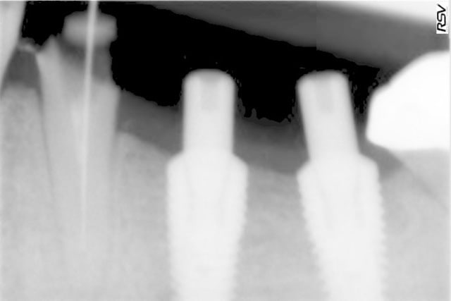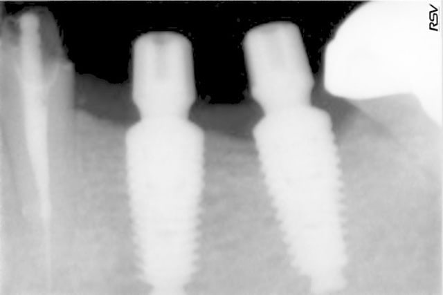 J'avais rencontré le même pb sur un cas que j'avais présenté sur ce forum sur des IDcam et l'on m'avait fait remarqué à raison que l'enfouissement de l'implant distal était insuffisant, résultat a 6 mois cratérisation mésial et distal du dernier implant et à un an stabilisation .