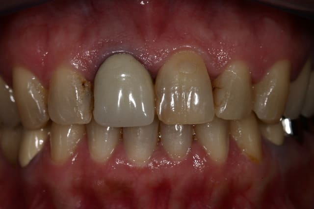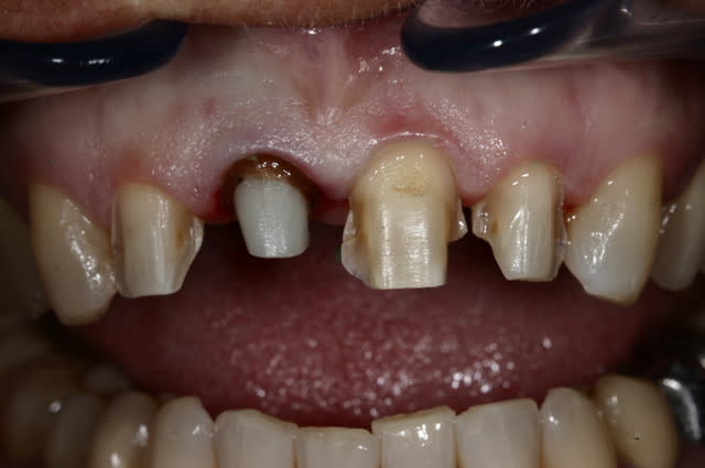un tout petit peu de chir ou tout simplement une couronne provisoire qui respecte le parodonte aurait permit de corriger l'aspect bleuté et la différence de hauteur des collets, non ?