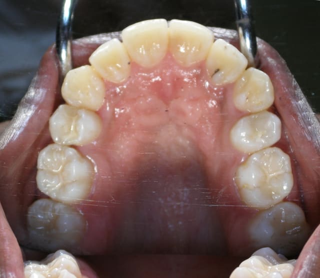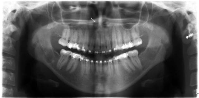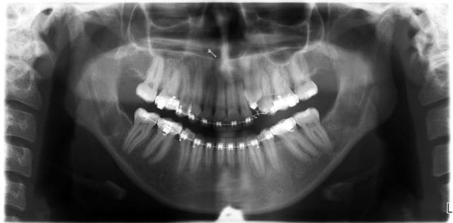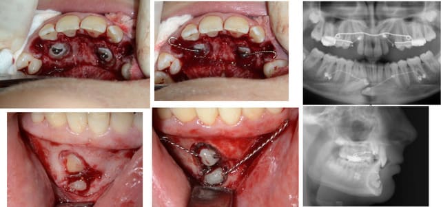 Dans ces deux cas-ci dont je joins les photos, je ne vois pas très bien comment tu aurais pu faire avec ta méthode. Le premier avait 4 canines incluses, j’ai utilisé un système traditionnel en haut (boutons collés sur les couronnes, ligatures et traction par cantilever) et des ligatures collées directement sur les couronnes et traction par CT8-1 en bas. Pour le second, je me suis servi de l’alvéole déshabitée de la 53 pour passer la ligature, avec un CT8-1. Dans ce dernier cas, où aurais-tu mis ta vis ?