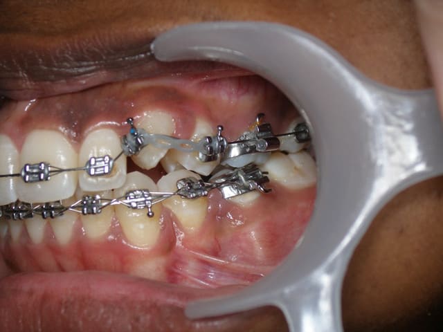 2. d'utiliser un auxiliaire métallique ( ligature avec toron, chainette or...) dans la partie sous muqueuse et de réserver la chainette ou fil élastomérique à la zone supra-gingivale.