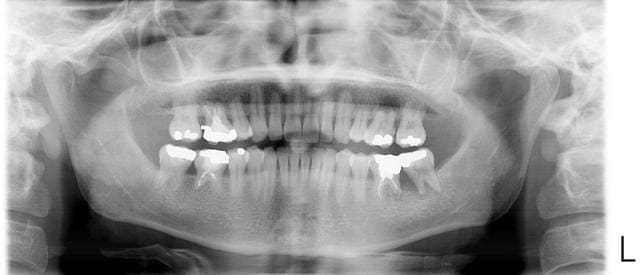 Si on regarde bien la pano, beaucoup de dents ont des racines résorbées. Les premières molaires sont celles qui semblent avoir le plus souffert. Peut-être à cause d'un traitement ortho.