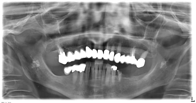 Euh justement vu le siège des calcifications sur ton document (4ème vertèbre sous la corne hyoïdienne), et la répartition des taches sur la pano, je pencherai aussi pour une lithiase parotidienne bilatérale.