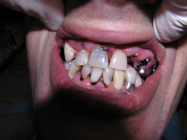 Cetains patients sont adorables: quand ils entrent pour la première fois, et nous parlent de "check-up", on se dit "oh, une hygiène parfaite, et on ne trouvera rien, meme pas un peude métal"...Puis deja sur le pano, les choses se gatent...Et lors de l'examen endobuccal, la, la situation parait un peu plus compliquée que prévu...Le prat le leur explique, et eux: "oh, vous savez, on a toujours eu les dents gatées dans la famille, mais comme ca ne fait pas mal...."