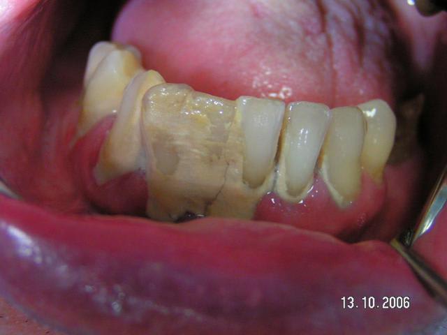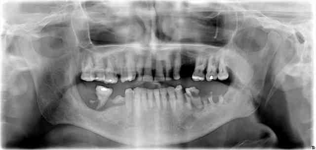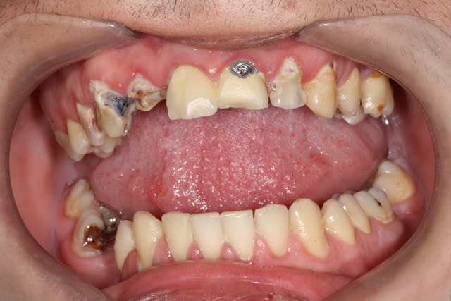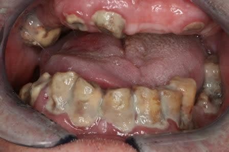 Ce patient n'a pas vu de dentiste (ni de brosse à dent) depuis 40 ans. Le motif de consultation est une "légère gêne" à la mastication côté gauche.