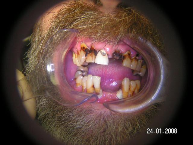 Ce patient n'a pas vu de dentiste (ni de brosse à dent) depuis 40 ans. Le motif de consultation est une "légère gêne" à la mastication côté gauche.