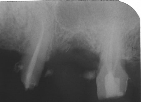 Quant à la racine mésial de la 26 , c'est une des premières coiffe métal que j'ai réalisé en 1997, et vu la forme fine de la racine j' y touche pas, elle ne m'empêche pas de dormir et le patient non plus .