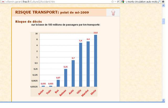 Ta dernière phrase est valable pour toi, mon petit loup, réfléchis un instant avant de réagir, la plupart des victimes sont des piétons et des deux-roues, en raison de la mixité de la circulation et de la fragilité de ces usagers face aux véhicules plus massifs et plus rapides, on est bien d'accord ? Si tout le monde roulait à moto, il est vraisemblable que le nombre de tués calculé selon les mêmes critères serait alors bien inférieur que ce qu'il est actuellement pour l'automobile et ce, à la fois pour les piétons ET les motards.