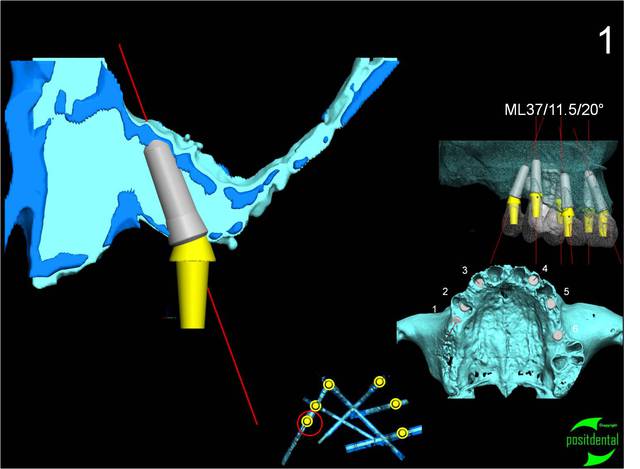 Dans ce cas clinique le praticien à utilisé les possibilités du guidage pour le placement de l'implant de longueur 11,5 mm incliné à 20° EASY implant pour éviter cette greffe. Il est à remarquer qu'avec un système à 30° un 13 aurait pu être choisi et que le travail sur les angulations sont parfaitement maitrisées puisque l'ensemble des piliers sont parallèles.