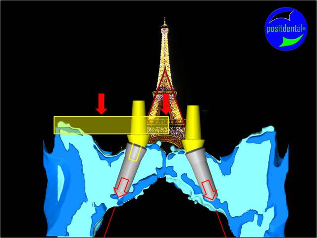 Je voulais simplement expliquer que dans une reconstitution complète implantoportée les forces sur l'implant angulé se reporte en pression en direction de l'apex de façon verticale comme les pieds de la tour EIFFEL qui s'appuient sur des socles en béton, d'où l'importance de l'armature rigide qui réparti et transmet les pressions verticales sur la paroi longitudinale du planché sinusal alors que sur une reconstitution unitaire angulée la pression est en cisaillement. Le maxillaire ayant une forme de coupole les pressions se concentrent au centre de l'arcade.