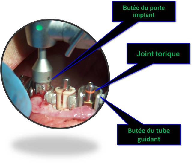 La clé de vissage auto débrayable que j'ai adapté pour les implants CAMLOG est pratique car lorsque la butée de celle-ci s'appuis sur la butée du tube guidant du guide, c'est que le niveau d'enfouissement programmé est atteint, aucun risque d'arrachement de l'implant puisque sont maintient est assuré par le joint torique