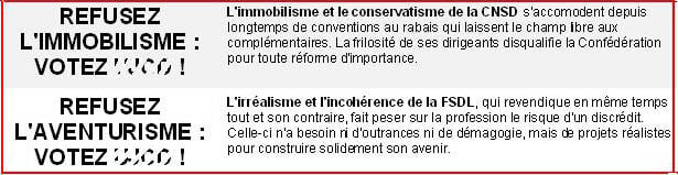 Je serais ravi pour toi que tes conditions d'exercice s'améliorent grâce à l'action de ton syndicat, mais de mon côté, comme je n'aime pas entrer en conflit avec moi-même, parce qu'après je me fais la gueule, je ne me parle plus, bref, je ne vais pas aller contre mes intérêts, et la FSDL a pris position CONTRE les non-spécialistes de tout poils, orthos, chir et quoi encore ?!