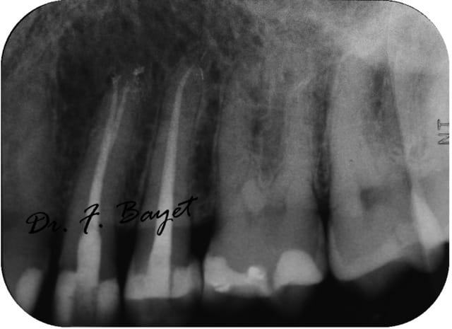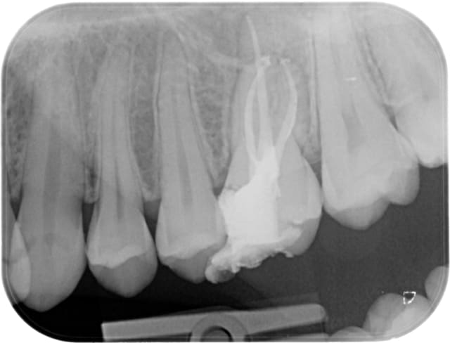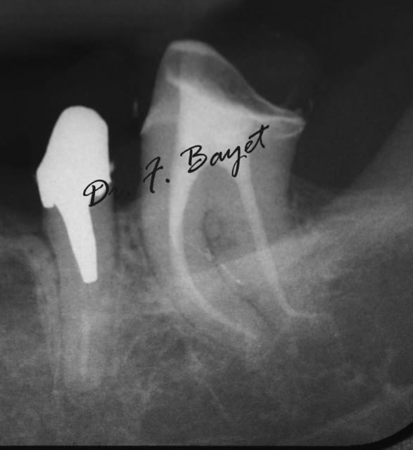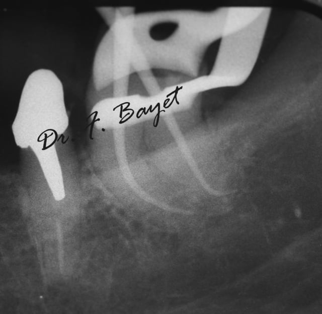 Exemple: sur une 38, cathétérisme au PathFile (violet, blanc, jaune) et WaveOne (toujours avec l'ATR), obturation systemB. Le crochet apical je l'ai découvert au moment de l'essayage des cônes !!