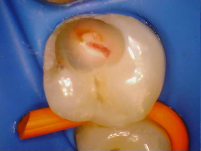 Faites la même chose avec de l'hydroxyde de calcium (dont l'indication était sur une effraction de la dimension d'une tête d'épingle) sur une brèche aussi large. À une semaine sensibilité thermique légère, réévaluation à un mois, patient de 42 ans.