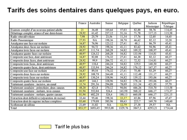 Le tarif dentaire suisse. Celui-ci est calculé rationnellement en prenant en compte le coût moyen pour chaque acte.