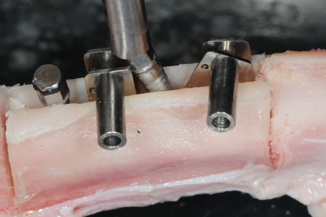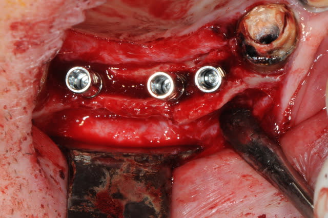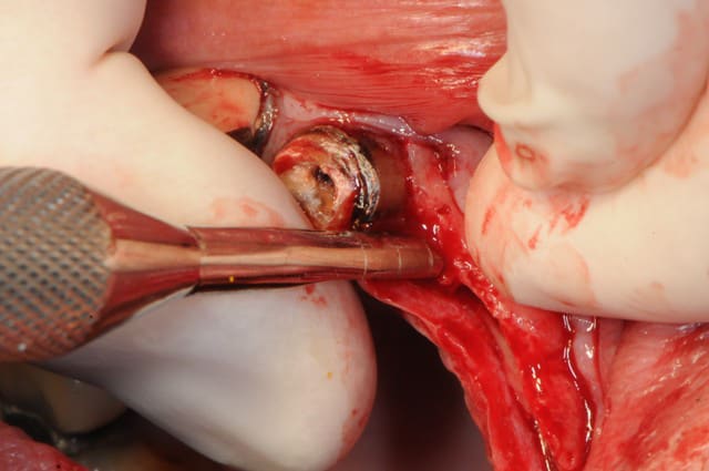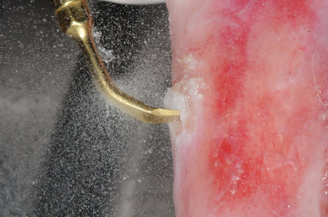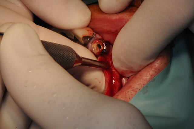 commentaire sur la première partie... greffe en ring avec implant simultanée. La greffe osseuse¨bouchon de bouteille de vin`` m'a été enseigné par le dr Poitras ( sans la pose immédiate d'implant ) indiqué pour les cas en post extraction dent unitaire ou la plaque osseuse buccale présente une perte importante. extraction... laissé guérir les tissus 5 à 6 semaines et greffé bloc osseux en provenance d.une tréphine au menton... préparation du site receveur avec le diamètre externe égale au diamètre interne de la tréphine du menton... le bloc osseux entre en légère compression, pas besoin de vis au contraire ... au marteau...attendre 4 mois de préférence et pose de l'implant