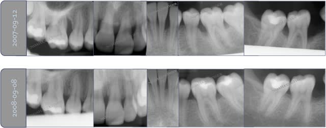 Cependant je crains que les clichés radiographiques que tu nous montres ne prouvent seulement un comblement (physique) d'un défaut osseux, mais non une réparation parodontale. Quels sont les paramètres cliniques locaux (BoP, PPD, ...)