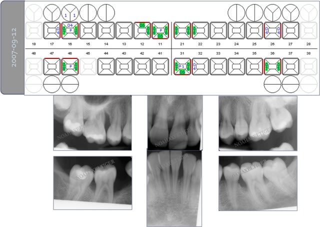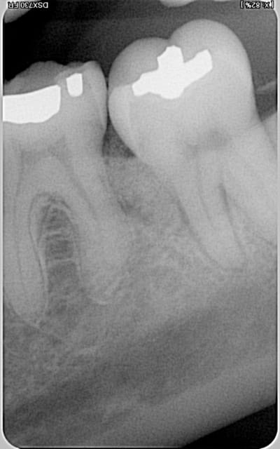 Cependant je crains que les clichés radiographiques que tu nous montres ne prouvent seulement un comblement (physique) d'un défaut osseux, mais non une réparation parodontale. Quels sont les paramètres cliniques locaux (BoP, PPD, ...)