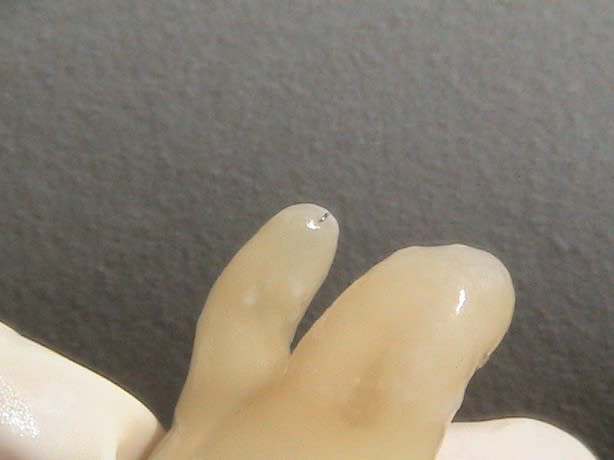 Sinon, tu peux faire tremper la dent dans de l'eau salée, ça marche aussi (le mieux, c'est de coincer la couronne dans le couvercle d'une boîte de film photo remplie d'eau salée, avec un trou dans le couvercle pour faire passer l'électrode labiale. Mais maintenant qu'on a tous des APN..)