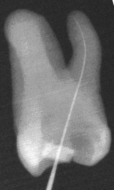 Parce qu'ici, qui sait si la mesure ne se fait pas uniquement lorsque la lime déborde, étant donné que la dent est sèche. Il faut que tout soit bien humide des deux côtés. Et puis ça dépend aussi du diamètre de la lime qui doit bien coincer au foramen.