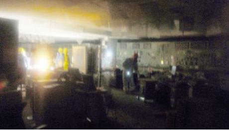 une salle de commande parcourue par des techniciens en combi anti contamination aéro portée + lampes torches