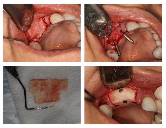 Greffon AlloDerm, 2 pins au centre (car je ne voulait pas taper dans les implants, extension-tunnel en mésial et distal, sutures.