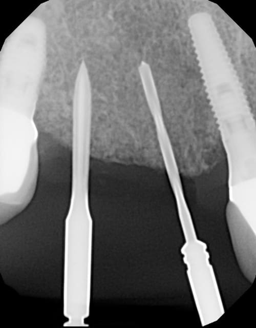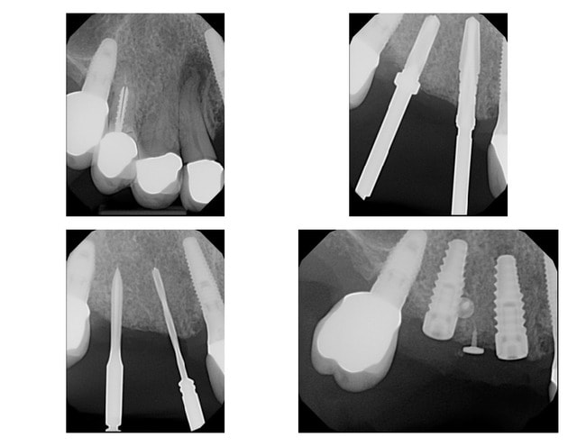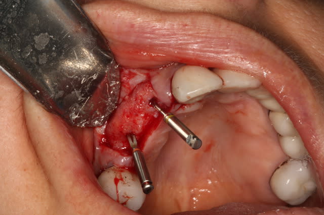 On voit bien l'angulation des implants déjà posés et des forêts initiaux.