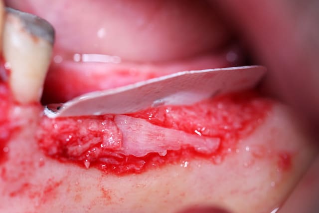 - elle est beaucoup moins souple que les membranes résorbables et conserve donc les volumes sans s’affaisser.