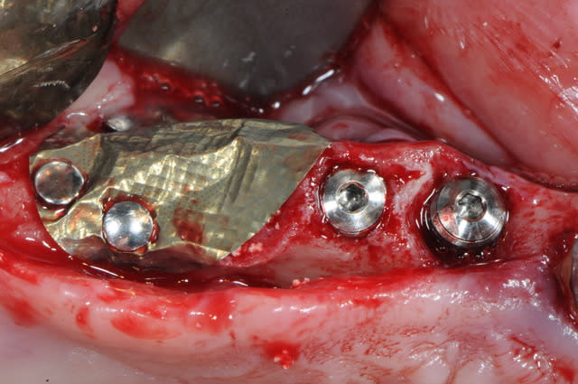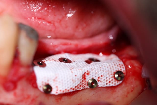 Pour dentiste 57, moi aussi j'utilise des membranes en titane mais pourquoi autant de clous et pourquoi ne pas recouvrir la tête de l’implant ? Tu génères un tissu de granulation avec encapsulation du greffon, rien de plus et c’est dommage.