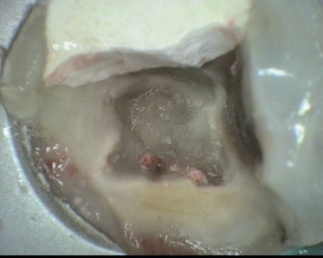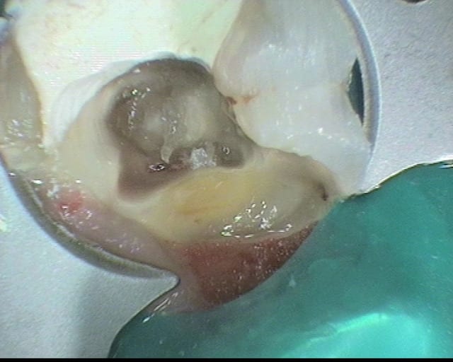 L’éviction des pulpolithes a été réalisée par ultrason. J'ai suivi une coloration entre ce que je pensais être de la dentine réactionnelle et le reste de chambre pulpaire comblée par un gros pulpolithe.