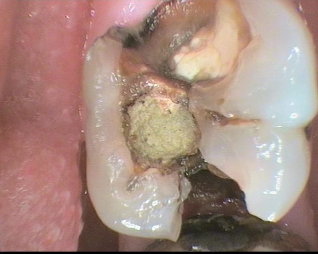 Peut-être que fouilla a aussi une vie de famille et qu'il a pris ce patient en urgence en pulpite à 19h30 et qu'il était fatigué, d'où l'absence de reconstitution pré-endo et le cavit pourri mis en place pour plusieurs semaines.