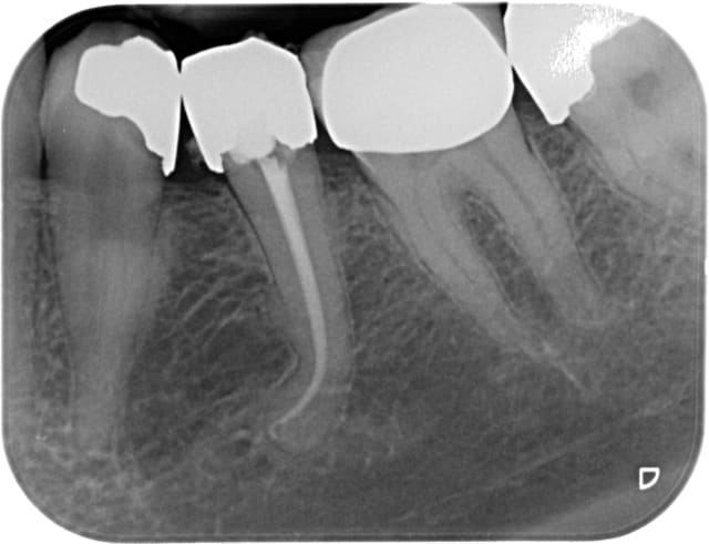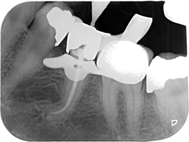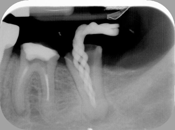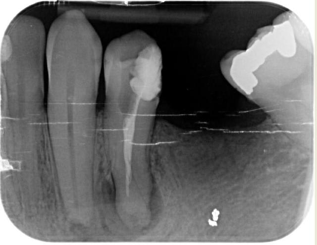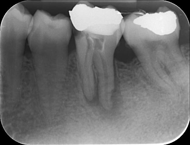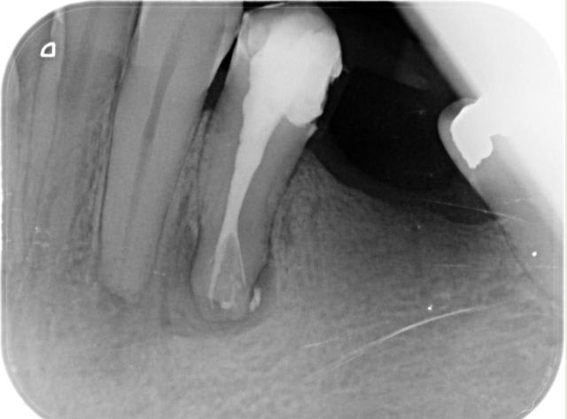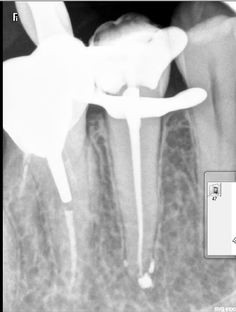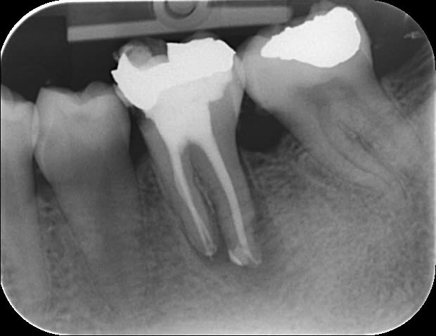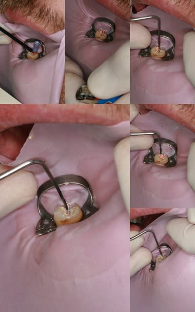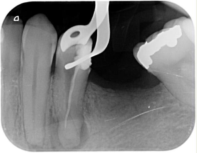 Et une compression au fouloir à amalgame de gutta sur le plancher pour compresser de la pâte sur des canaux accessoires du plancher, ici apparemment absents.