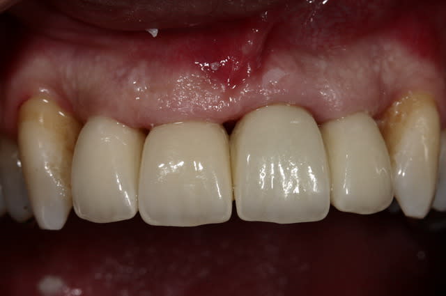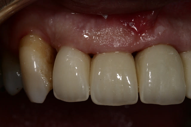 N'as tu pas peur de fracturer tes zircones avec des IC si "affûtées", perso j'aurais arrondie les angles. Ici la teinte reste difficile à obtenir, la réussite vient surtout d'un état de surface (microgéométrie) et d'une luminosité bien choisie, car très bon protho., surement bon renseignement (photo, teintier 3D master bien réalisé) on en vient à regreter que la gencive ne soit pas au top.