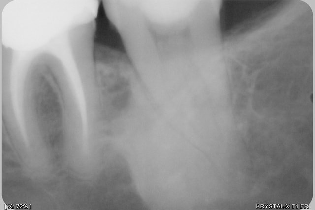 Quelle peut-être la nature de l'image radioopaque en mésial de la dent et quelle devrait-être la conduite à tenir en cas d'extraction (dent fissurée que j'espère sauver)?